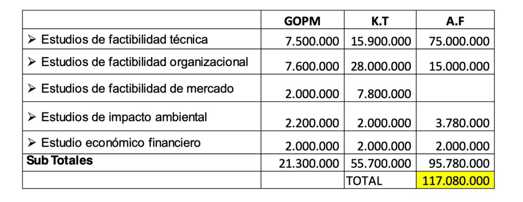 En este ejemplo, las necesidades de capital consolidados que arrojan los estudios de factibilidad permiten determinar el valor de la inversión en, a lo menos, 117 millones de pesos.